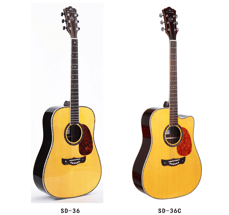 ST.PAUL 圣保羅SD-36,一款高貴不失典雅的吉他。面板用料精選頂級云杉單板。背側板的玫瑰木設計讓其音質更加飽滿圓潤。