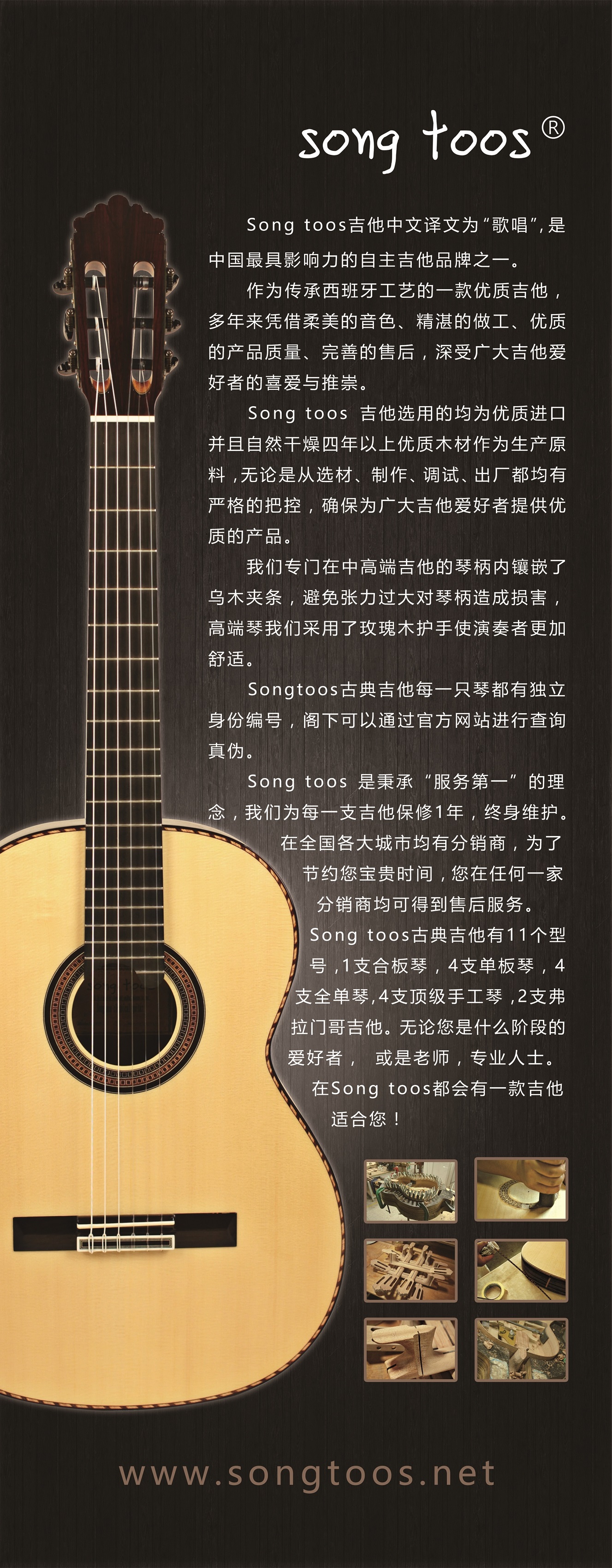 Song toos吉他選用優(yōu)質(zhì)進(jìn)口并且自然干燥四年以上的木材在國內(nèi)生產(chǎn)的國產(chǎn)品牌吉他。專門在中高端吉他的琴柄內(nèi)鑲嵌了烏木夾條,來避免張力過大對(duì)琴柄造成的傷害,高端琴我們采用了護(hù)手使演奏者更加舒適。