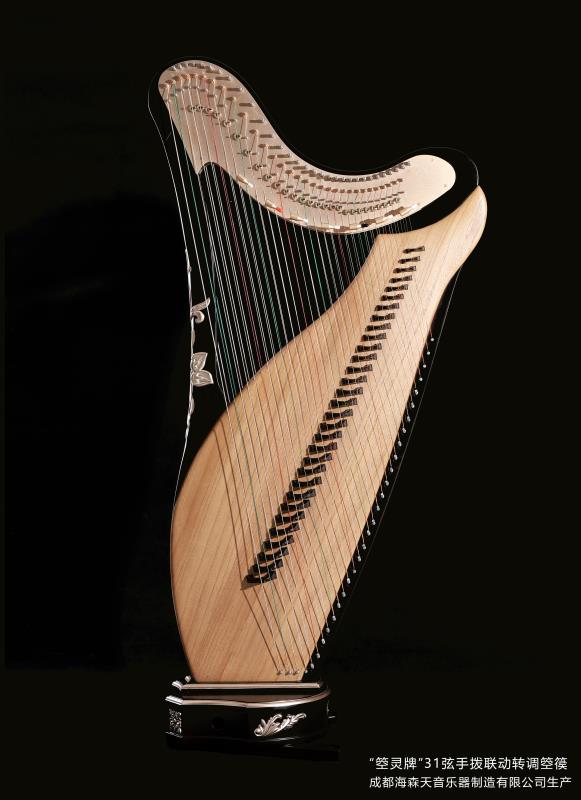 31弦手撥聯動轉調箜篌是我公司新研制產品,琴身有金粉描花,音色圓潤,轉調器上有不同的顏色,以便彈奏時轉調反應更加快速。