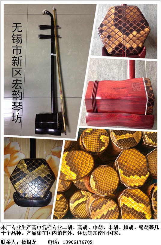 無錫市新區(qū)宏韻琴坊專業(yè)生產(chǎn)高中低檔專業(yè)二胡、高胡、中胡、申胡、越胡、錫胡等幾十個品種。本廠的產(chǎn)品除在國內(nèi)銷售外,還遠銷東南亞國家。