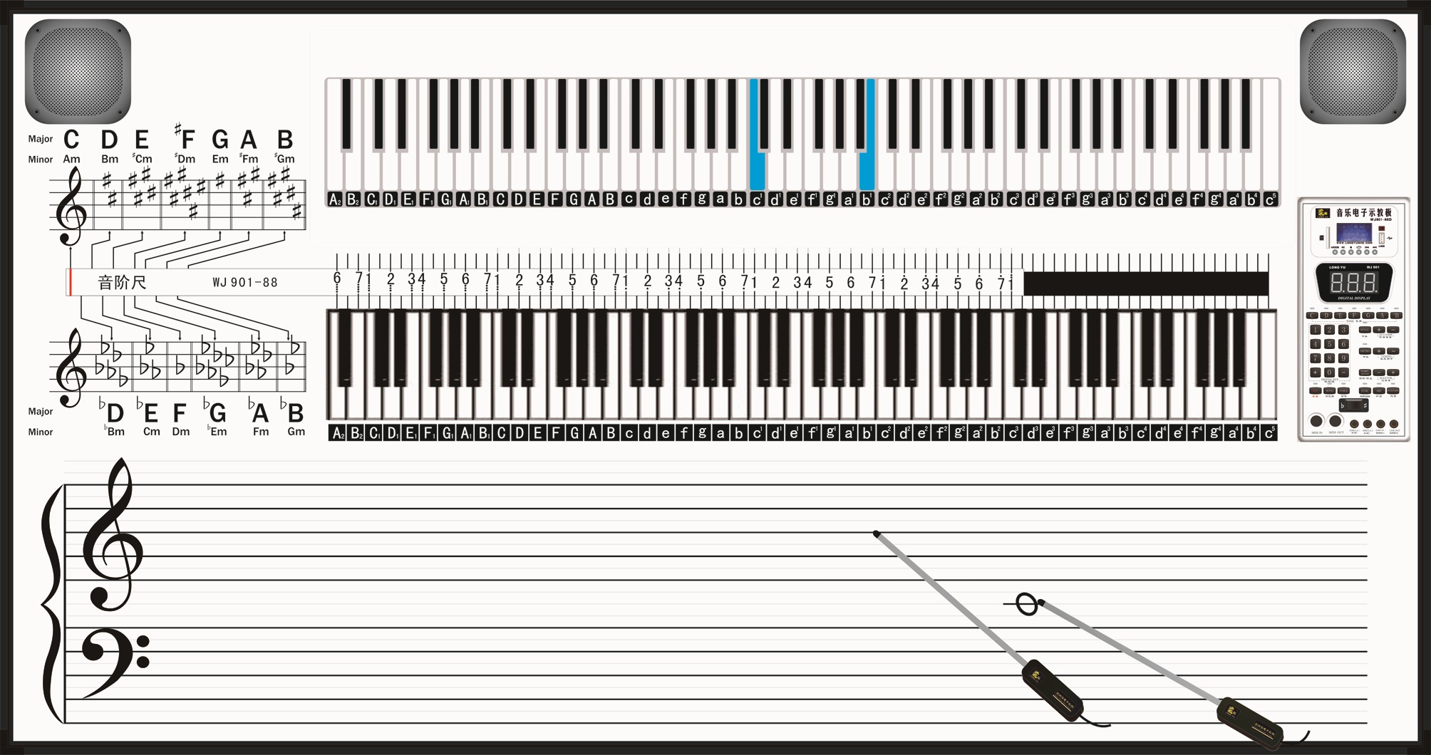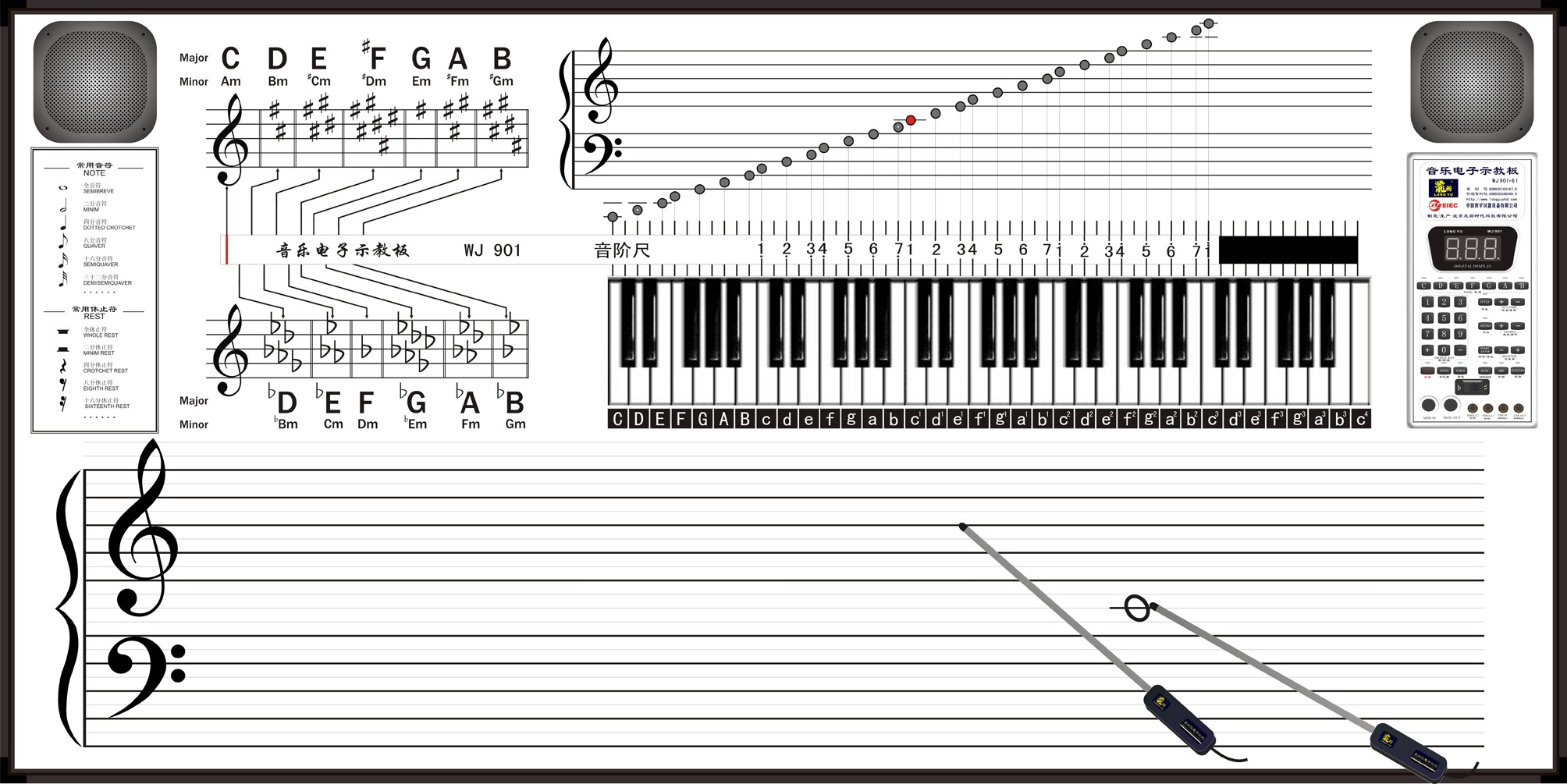 產品集成了實物電鋼琴鍵盤、感應式五線譜、五線譜對應鍵盤燈光顯示、樂理公式、樂理滑動標尺等多功能組合,能夠講授鍵盤指法、五線譜識譜、簡譜、調名、調號、變調、音名、音階、音程、音符、休止符、和弦、節拍等多種基礎樂理知識,并可進行律制的演示及研究。音樂電子示教板具有直觀性,老師的演奏指法和技巧一目了然,用教鞭指在五線譜上,同手彈鍵盤一樣,也可聽到準確的唱名,實現真正的全面樂理教學,是音樂課堂的理想教具。