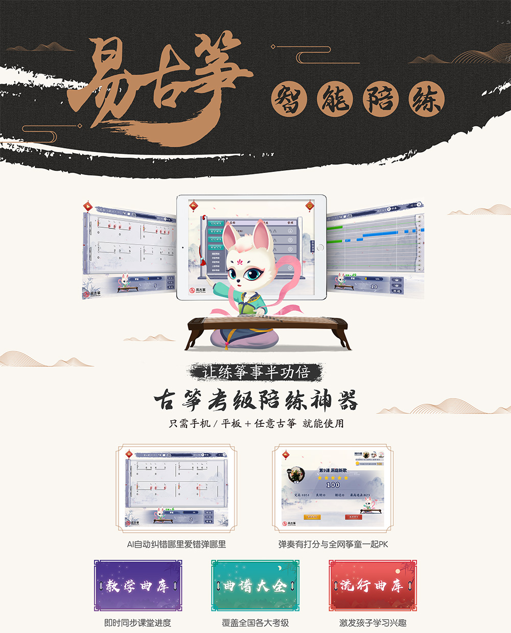 易古箏電聲識(shí)別箏,鏈接易古箏智能教學(xué)系統(tǒng),可進(jìn)行箏音識(shí)別,實(shí)時(shí)打分,讓古箏er對(duì)自己的箏音水平一目了然。
