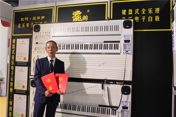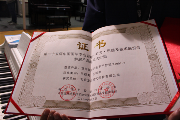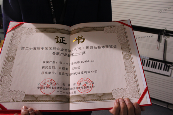 現在升級換代產品,還加入了不同樂器的音色。其中,音樂電子示教板WJ901-49和雙排鍵音樂電子示教板WJ901-2這兩款產品還榮獲了第二十五屆中國國際專業音響·燈光·樂器及技術展覽會參展產品技術進步獎樂器類三等獎。在記者與魏劍羽交談期間,恰巧見證了展會組委會向魏總頒發證書這一值得紀念的瞬間。
