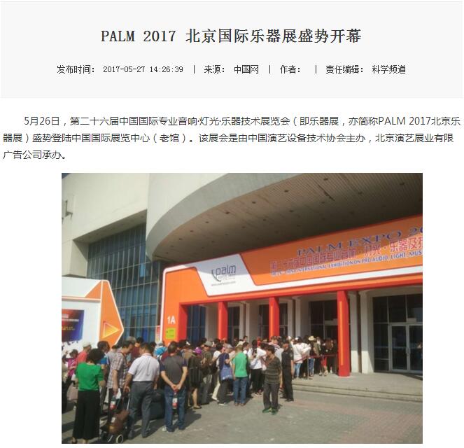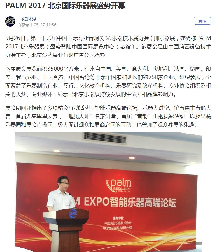 PALM 2017 北京國際樂器展,5月26日火熱開展。本屆展會除了有令人期待的中外知名樂器企業(yè)帶來的新產(chǎn)品、新技術(shù)外,還有智能樂器高端論壇、“遇見大師”名家講堂、樂器大講堂、樂器直播間,以及木吉他大賽、首屆尤克里里大賽等更多的技術(shù)交流和賽事活動(dòng),更有音樂界的大咖到展會與觀眾近距離互動(dòng),精彩紛呈。精彩的展會吸引了包括中新網(wǎng)、北京電視臺、今日頭條在內(nèi)的眾多媒體紛紛報(bào)道,熱度持續(xù)不減。